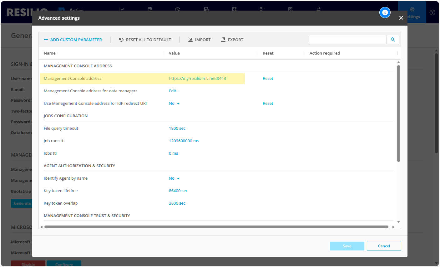 - In the Management Consoles Advanced parameters, define the Management Console address as a hostname so that when you switch between the two instances, all services will continue to work.