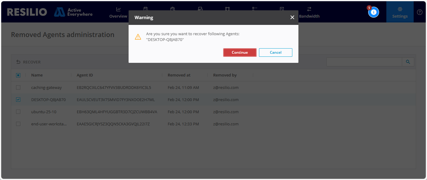 A Super Administrator or Administrator user role is required to recover a removed Agent.
