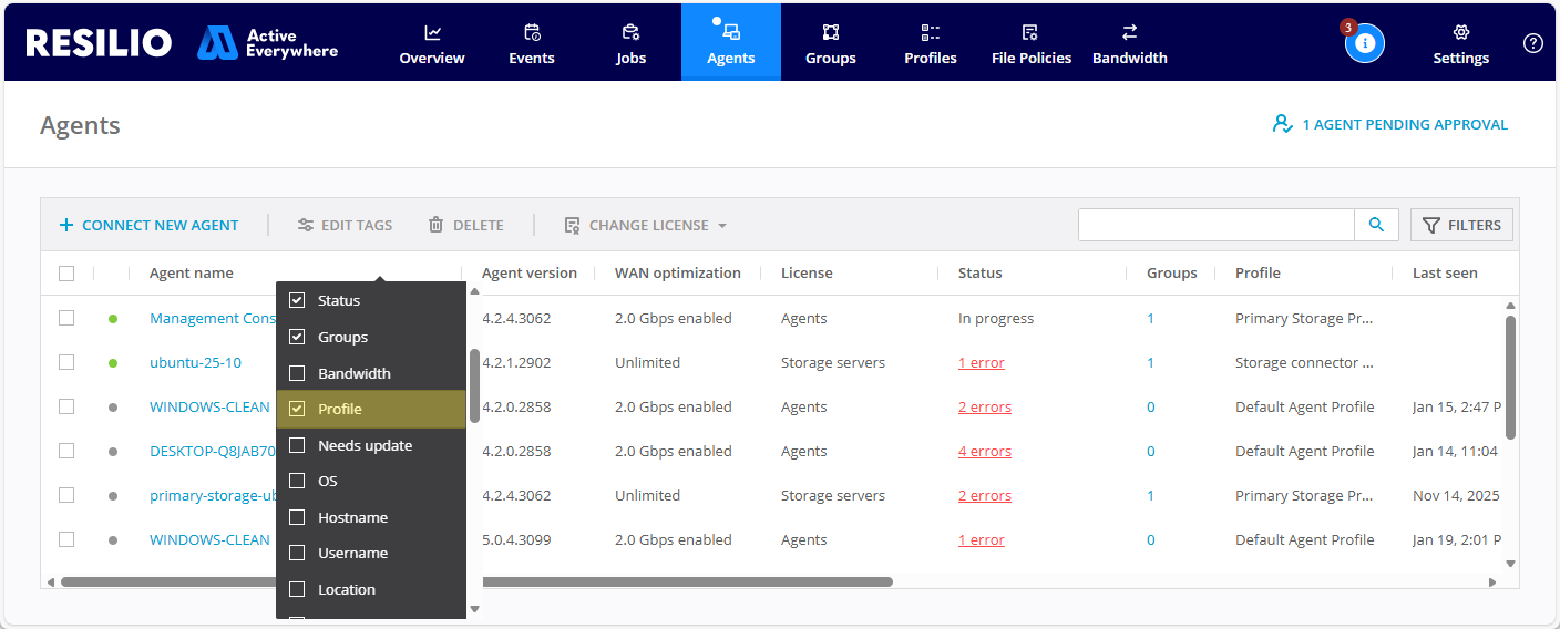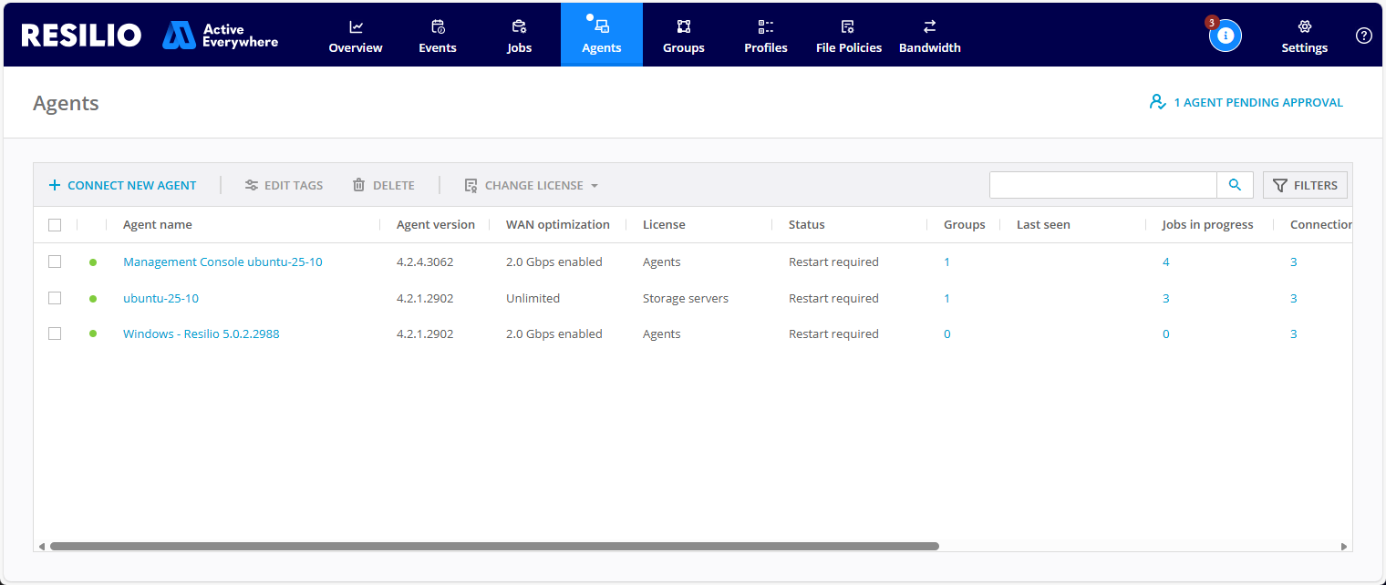 In addition to being mentioned in the Profile, any Agents that need to be restarted will also display a Restart required status in the Agents list.