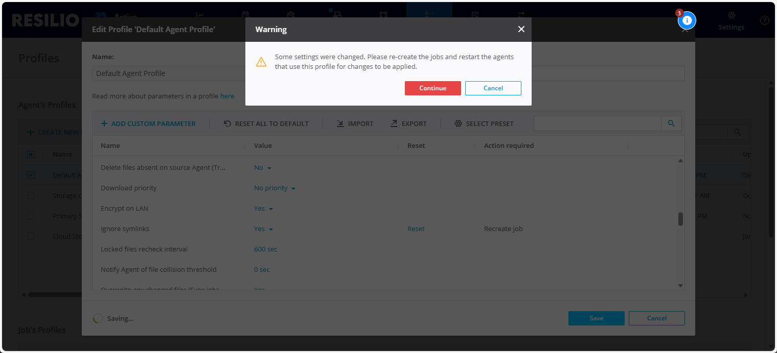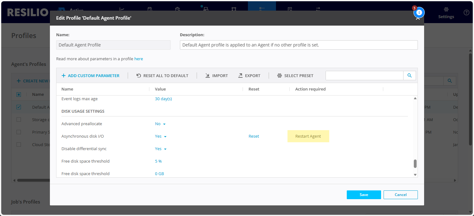 - The required action can be either Restart Agent or Recreate Job and it's showed once, when you edit the value. Once you close and re-open the Profile, the Action required column will reset.