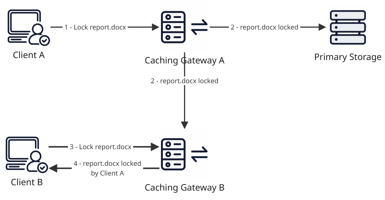 - Caching Gateway B checks its local file locking database and notifies Client B that the file is already locked.