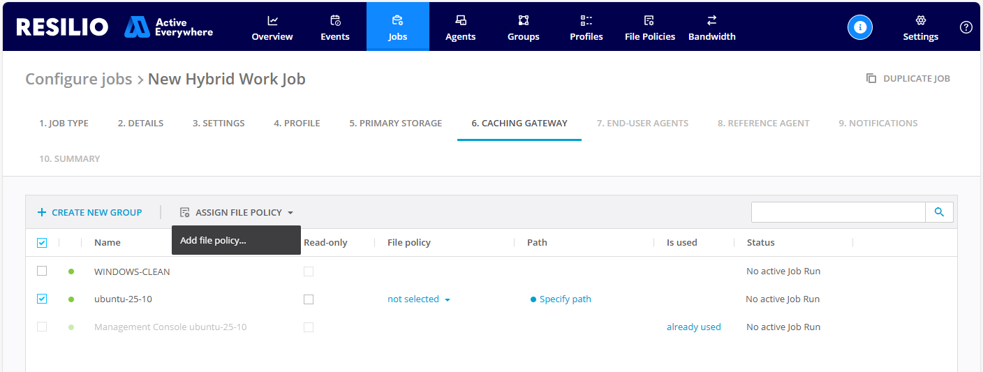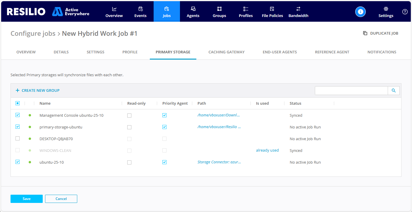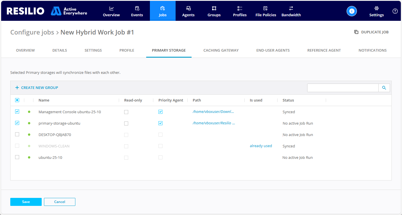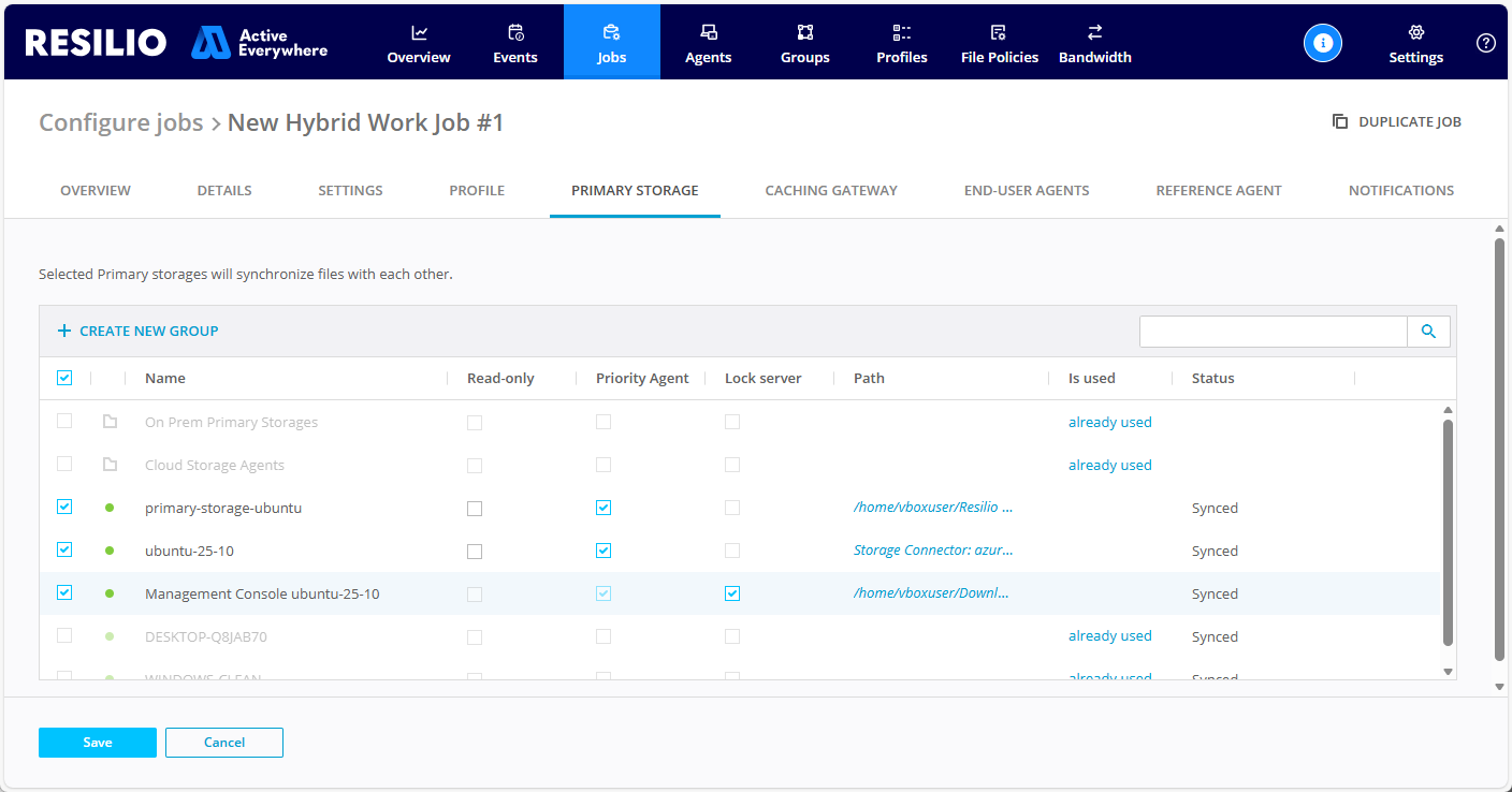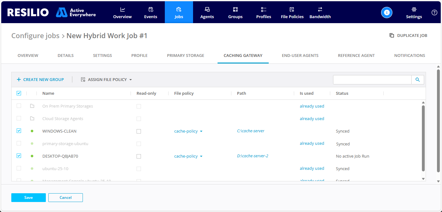 - Define synchronization jobs specifying primary storages, caching gateways (optional), and end-user devices (optional).