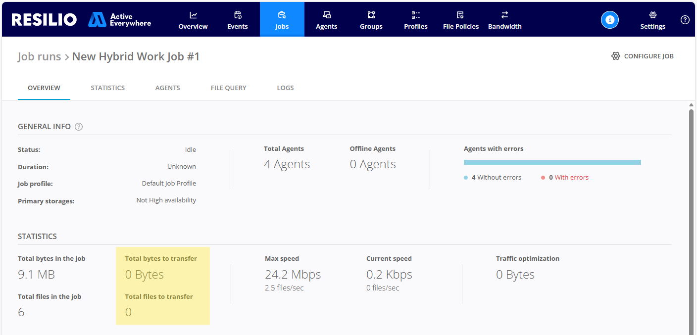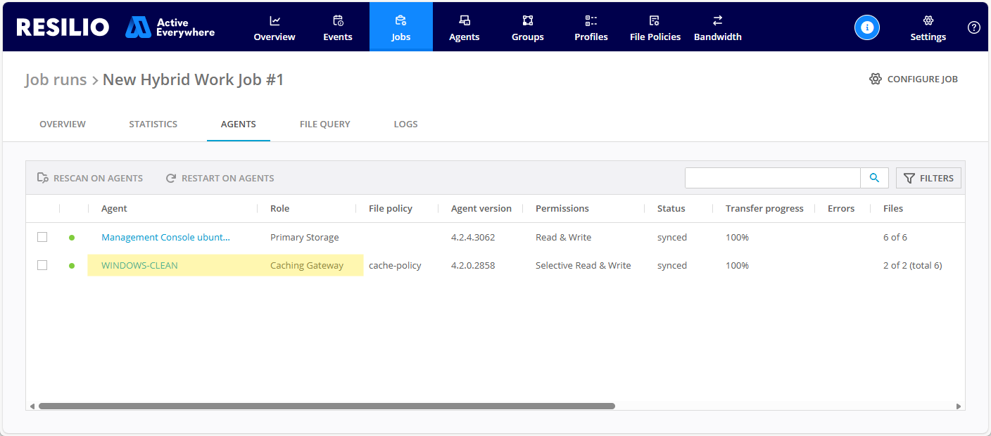 - Once the replication between the Primary Storages is complete, the Agents tab inside the Job Run view will show that all Primary Storages have the same number of files on them.