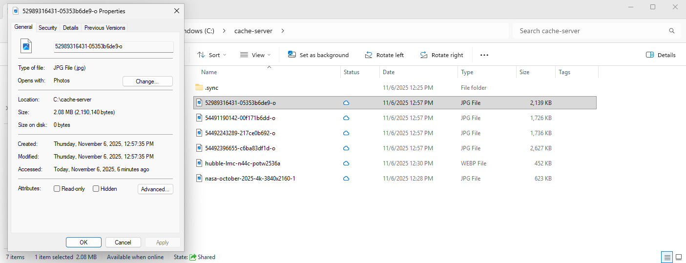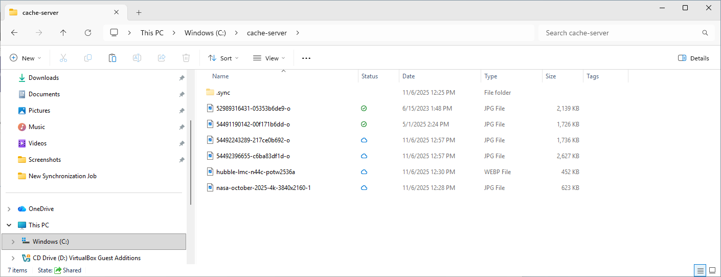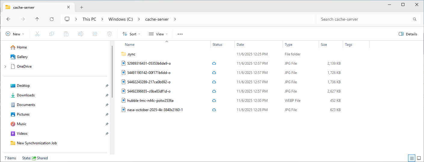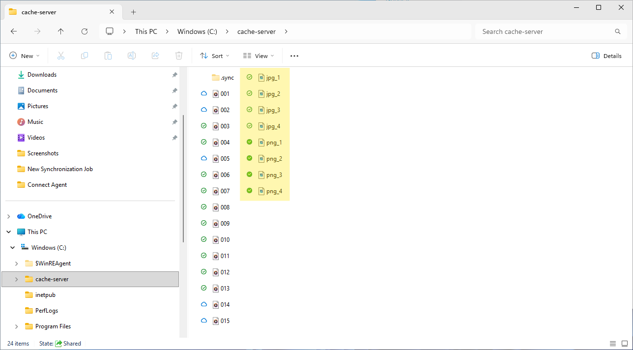 JPG files have a clear background checkmark icon, meaning that they have been downloaded from the Primary Storage (pre-heated), but they will be dehydrated according to the cache clearing settings.