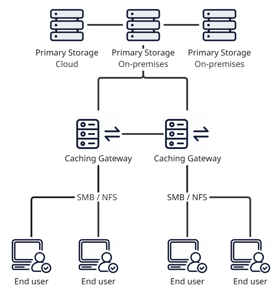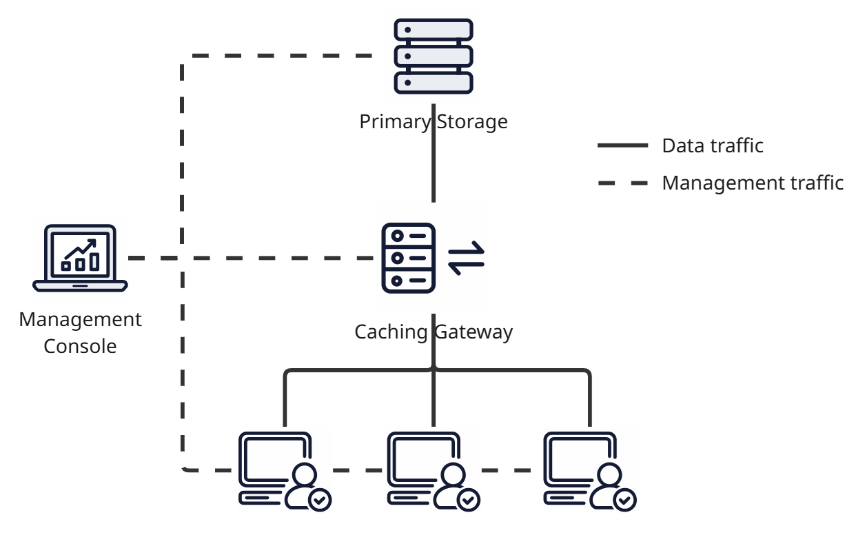- Local Caching Gateways: Deployed at each site to serve frequent file requests rapidly.