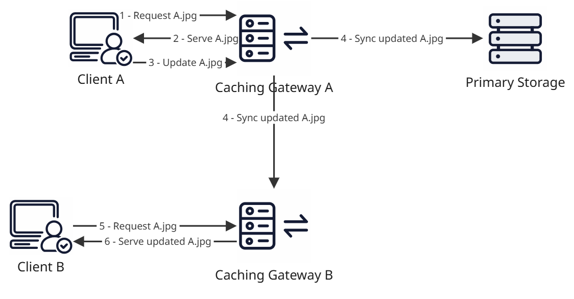 - Client B retrieves the updated file from the Caching Gateway without accessing central storage.