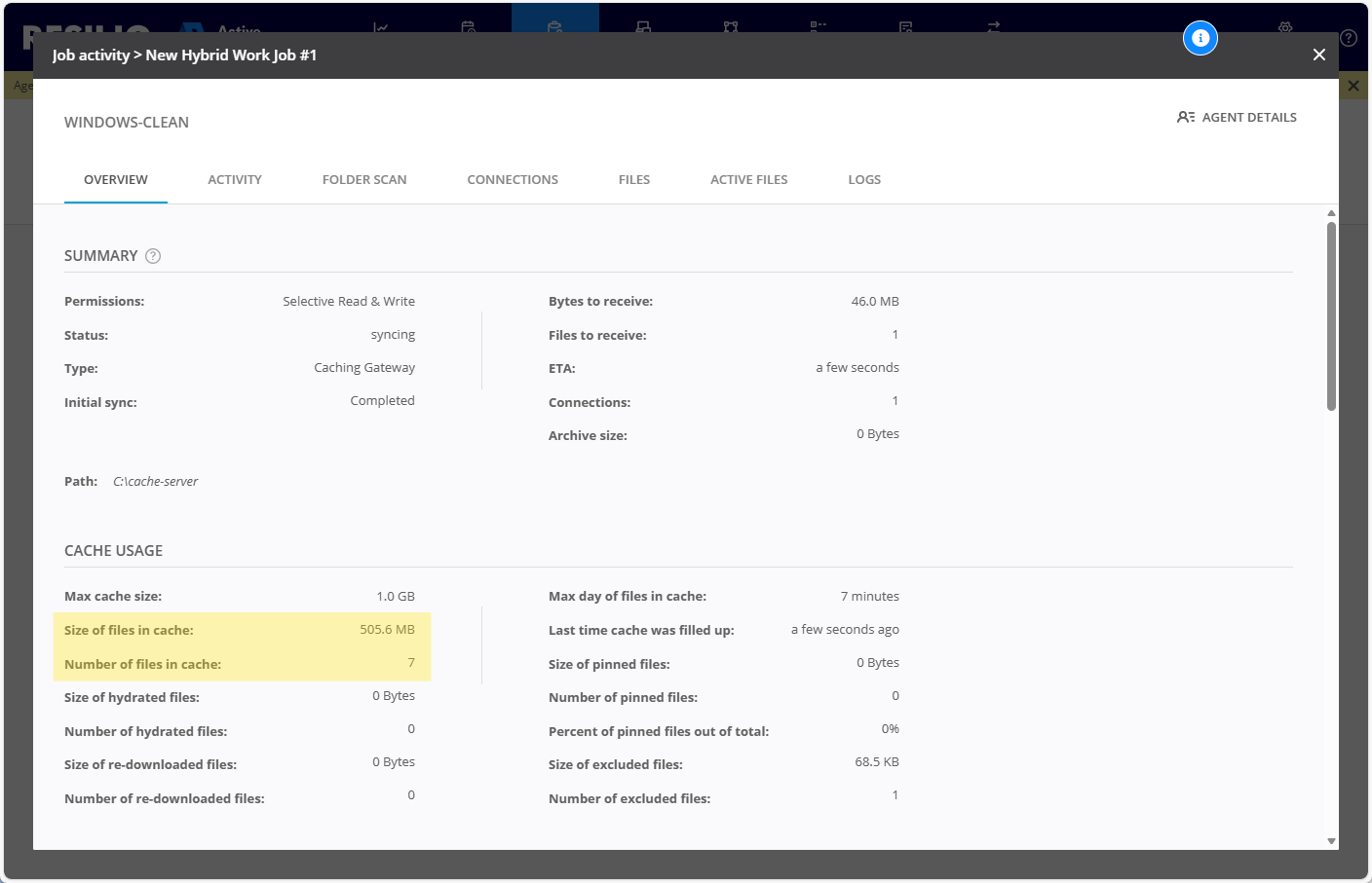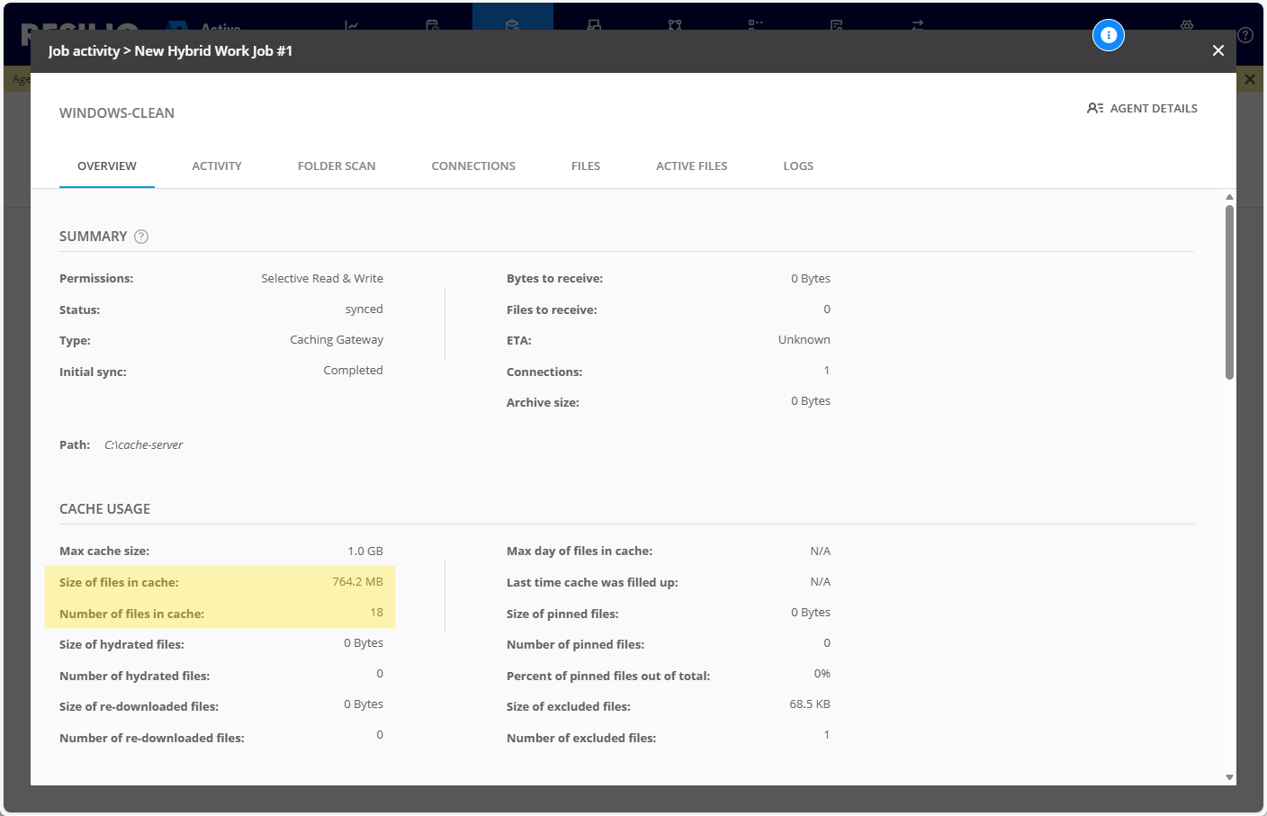 - Notice how after exceeding 800 MB, the Agent on the Caching Gateway will start freeing up the storage space occupied by cached files. The dehydration queue is based on access time - files with the oldest timestamp are dehydrated first.