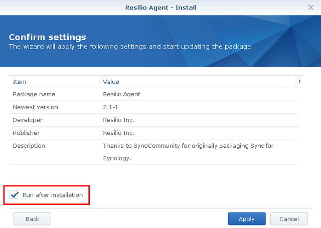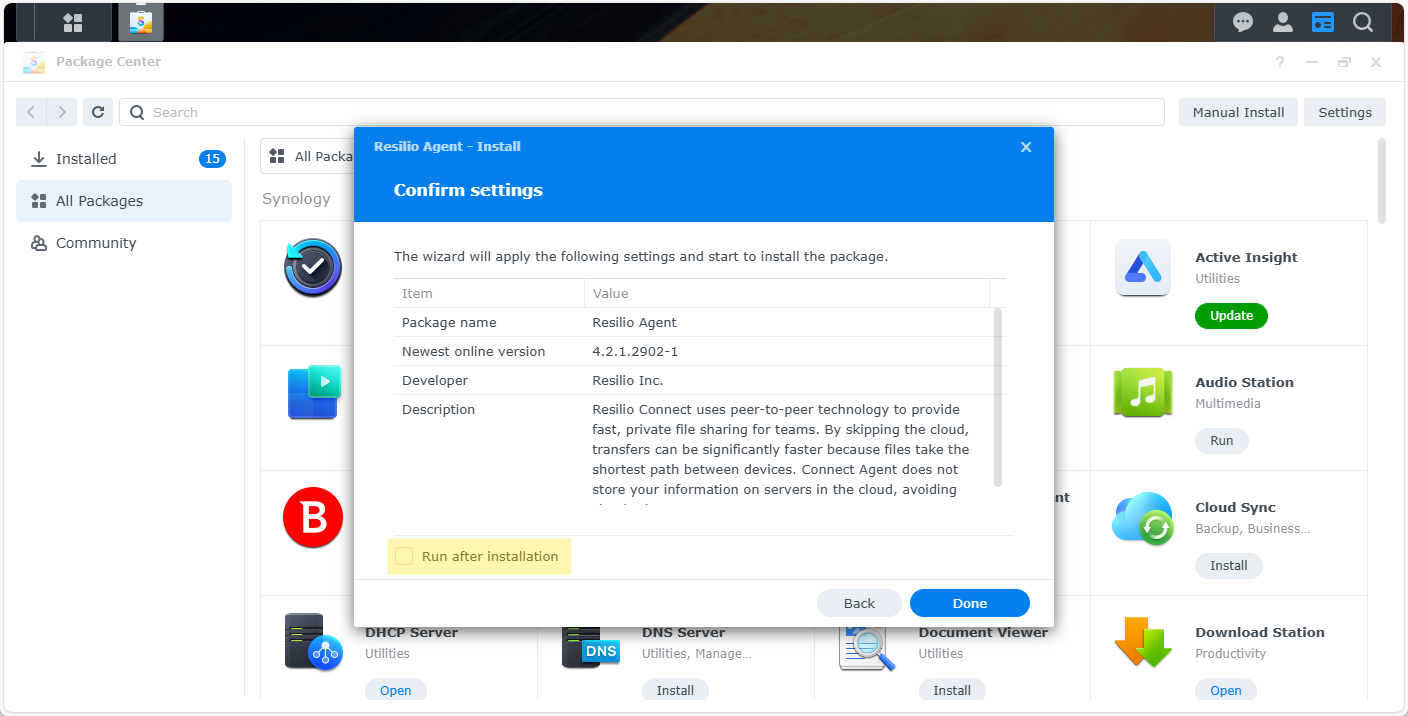 - In the Package Center, locate the Resilio Agent package and click Run.