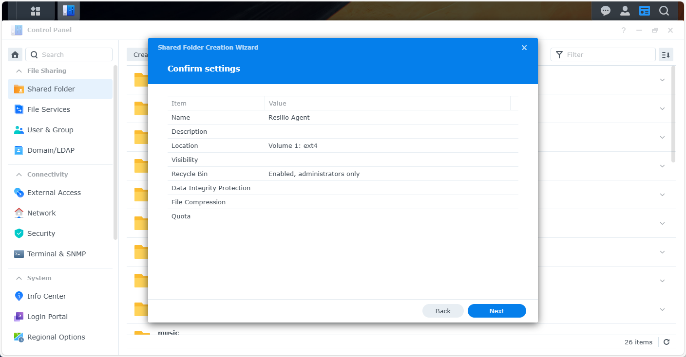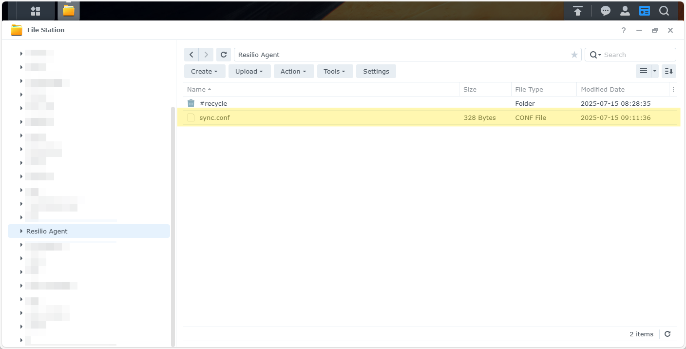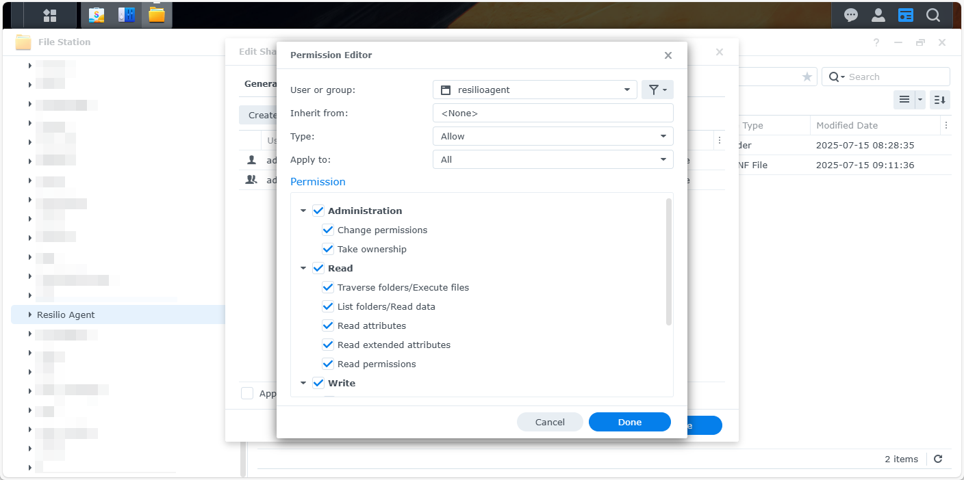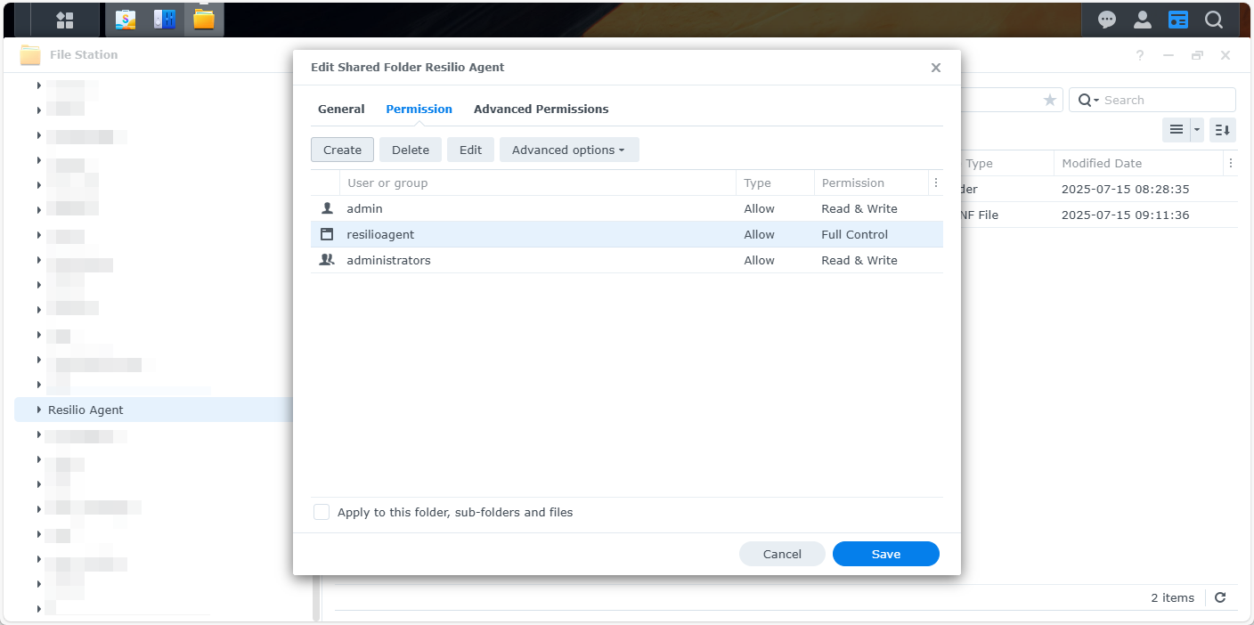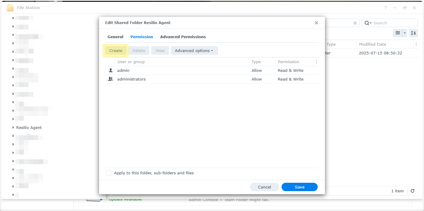 - In the File Station, locate and right-click the Resilio Agent shared folder, then click Properties.