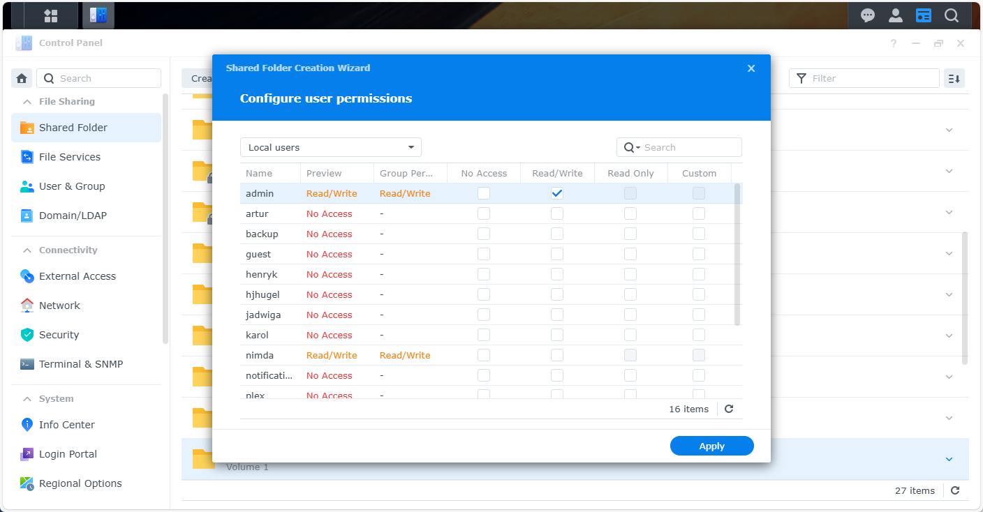 - Assign the Read/Write permission to the admin user, then click Apply.