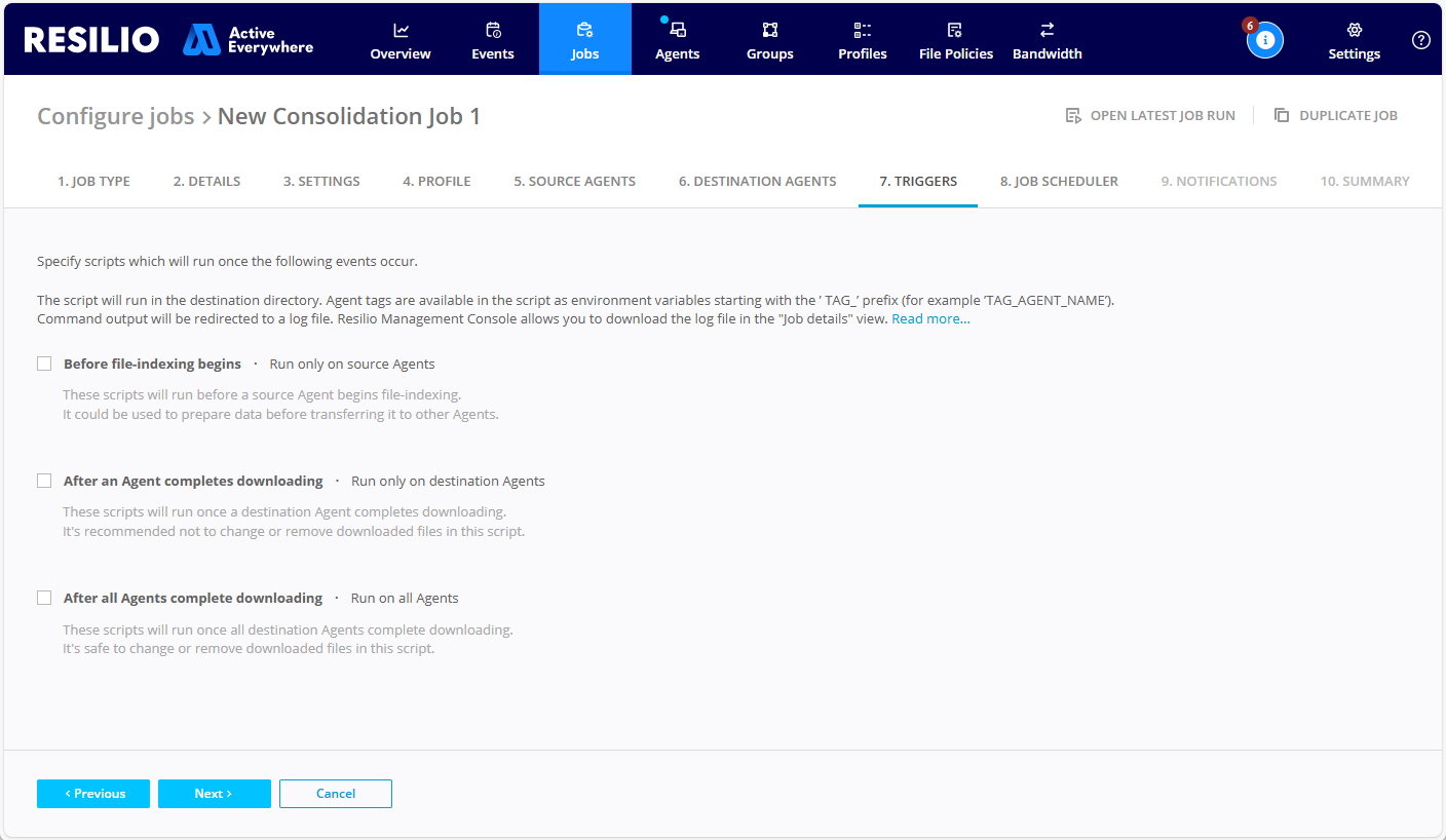 - Before file-indexing begins - When you create a Job, the first thing the source Agent does is indexing files in the specified folder. This option enables running a script before the indexing begins. The script can, for example, scan the folder and remove irrelevant, temporary files that are output automatically along essential artifacts.
