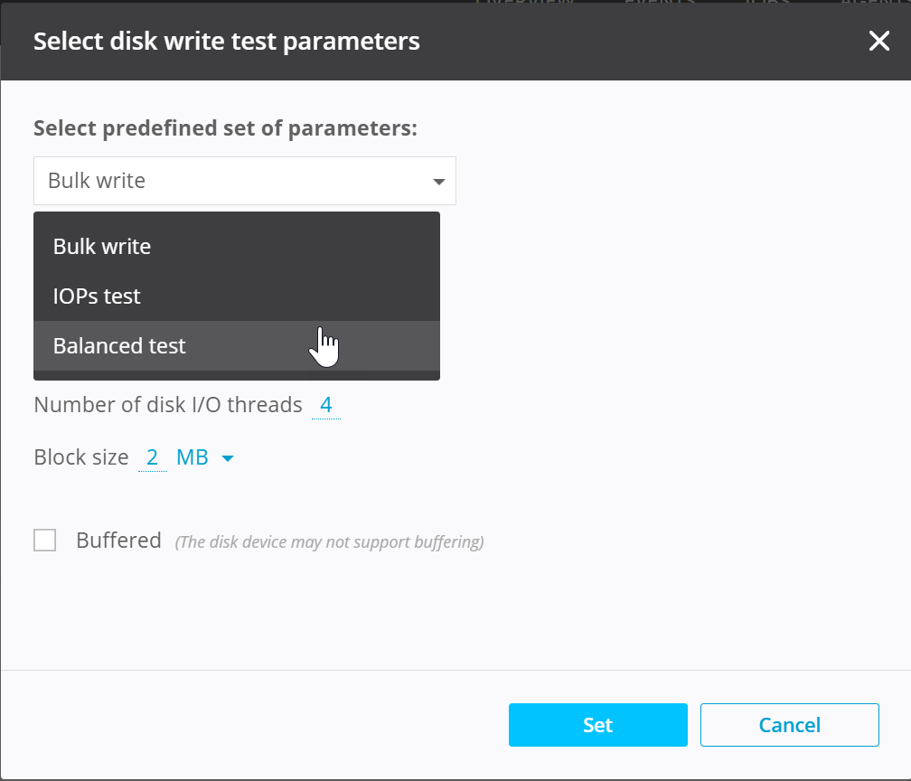 Number of disk I/O threads. Same as the parameter in the Agent profile, it’s the number of disk threads to write the test files. Usually fast storages are capable or writing the data in multiple threads, while low-end storages may work only with fewer threads. If unsure, keep default value.